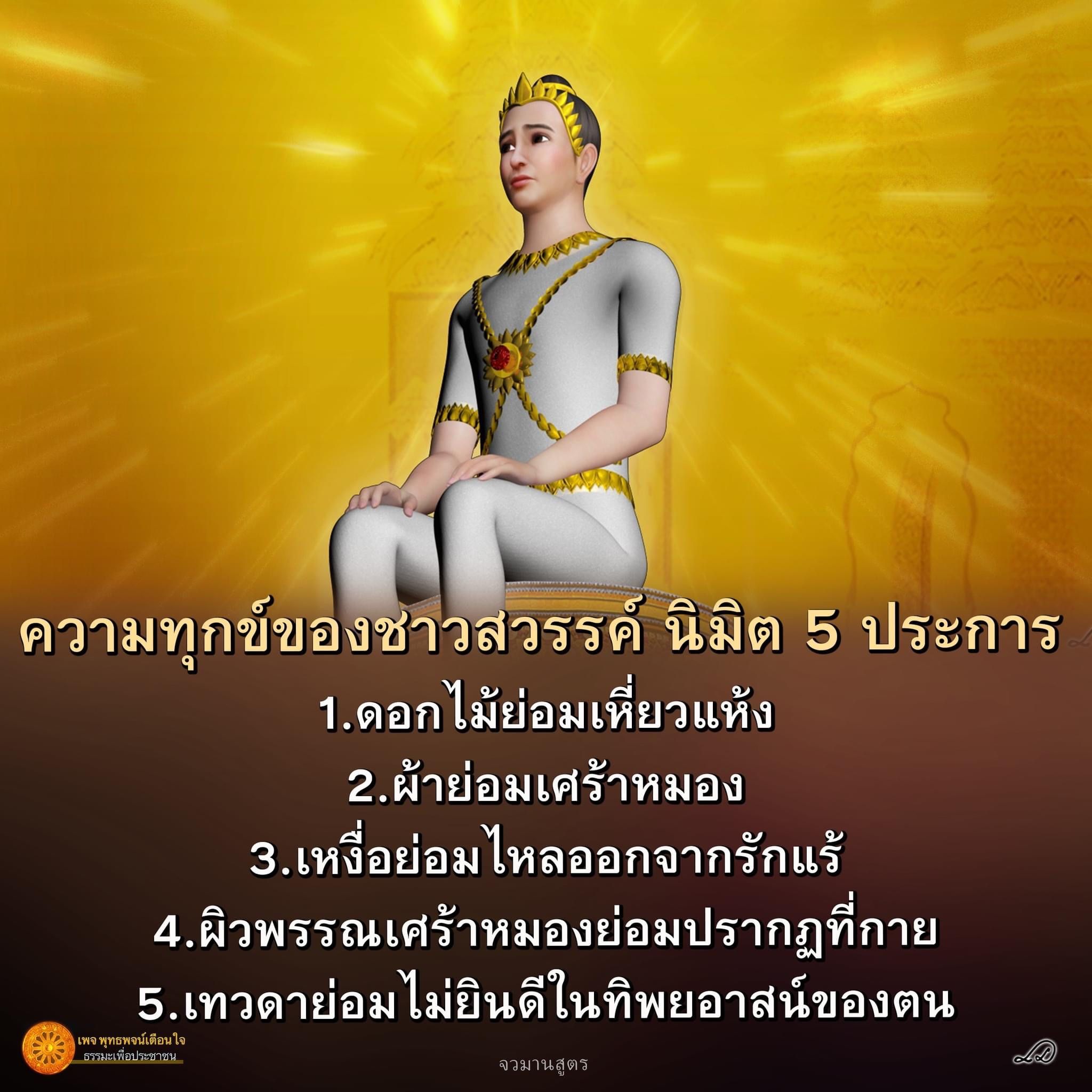 “ดูก่อนภิกษุทั้งหลาย เมื่อใด เทวดาเป็นผู้จะต้องจุติจากเทพนิกาย เมื่อนั้น นิมิต 5 ประการ ย่อมปรากฏแก่เทวดานั้น คือ 1.ดอกไม้ย่อมเหี่ยวแห้ง 2.ผ้าย่อมเศร้าหมอง 3.เหงื่อย่อมไหลออกจากรักแร้ 4.ผิวพรรณเศร้าหมองย่อมปรากฏที่กาย 5.เทวดาย่อมไม่ยินดีในทิพยอาสน์ของตน