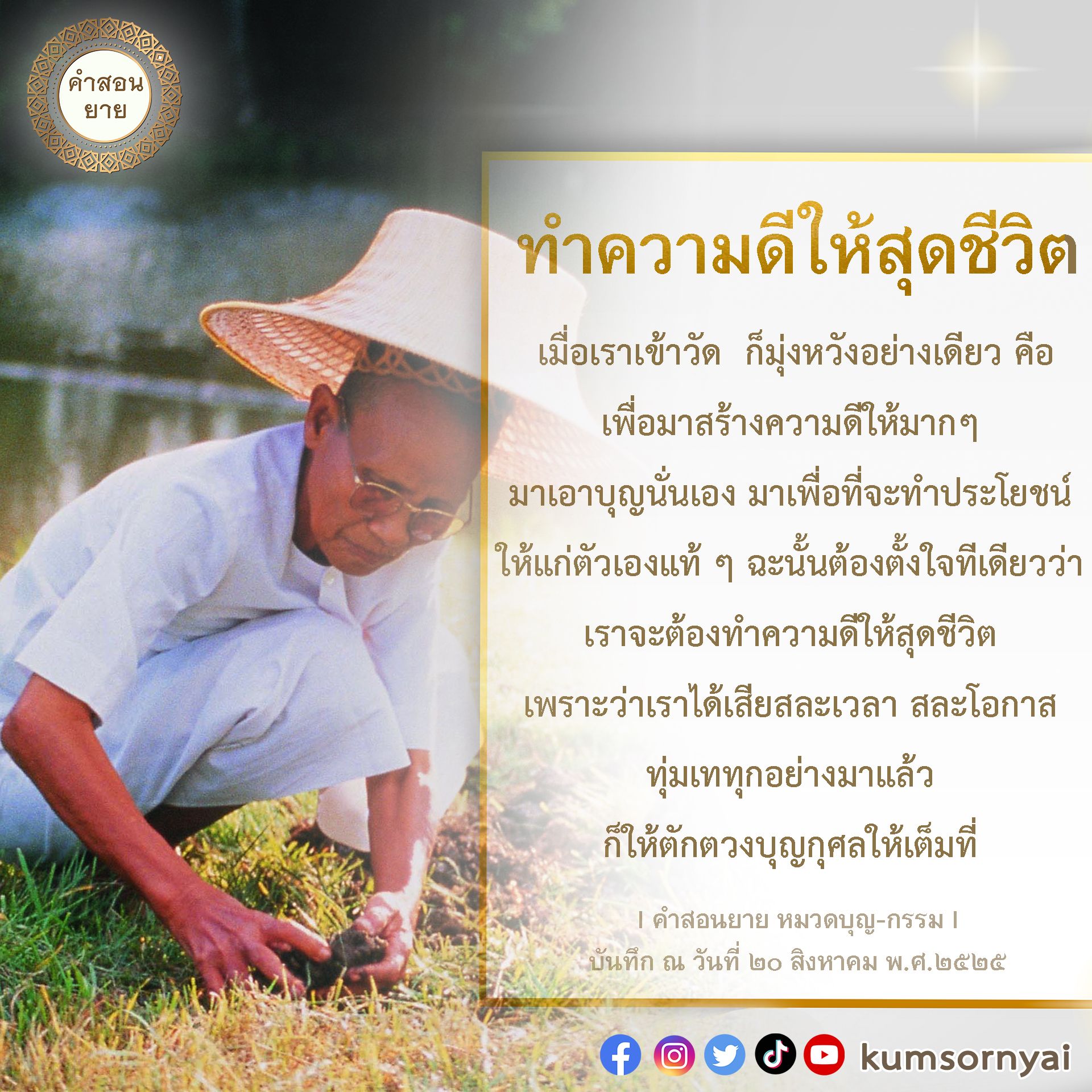 เมื่อเราเข้าวัด ก็มุ่งหวังอย่างเดียว คือ เพื่อมาสร้างความดีให้มากๆ มาเอาบุญนั่นเอง มาเพื่อที่จะทำประโยชน์ให้แก่ตัวเองแท้ๆ ฉะนั้นต้องตั้งใจทีเดียวว่า เราจะต้องทำความดีให้สุดชีวิต เพราะว่าเราได้เสียสละเวลา สละโอกาส ทุ่มเททุกอย่างมาแล้ว ก็ให้ตักตวงบุญกุศลให้เต็มที่