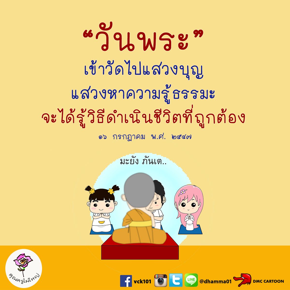 เราชาวพุทธต้องหยุดวันพระ ไปเข้าวัด ฟังธรรม ปฏิบัติธรรม ไปบำเพ็ญบุญกิริยาวัตถุ ๑๐ ประการ หรืออย่างน้อยก็ ๓ ประการ คือ ทำทาน รักษาศีล เจริญภาวนา เป็นต้น และทุกครั้งที่ไปวัด อย่าลืมชวนบุตรหลานของเราไปด้วย