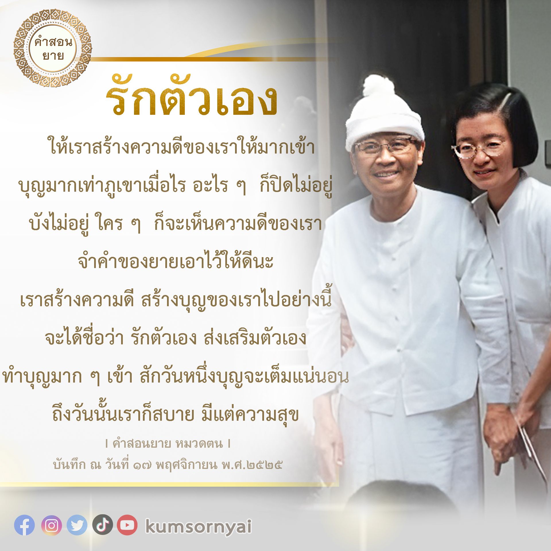 ให้เราสร้างความดีของเราให้มากเข้า บุญมากเท่าภูเขาเมื่อไร อะไรๆก็ปิดไม่อยู่ บังไม่อยู่ ใครๆก็จะเห็นความดีของเรา จำคำของยายเอาไว้ให้ดีนะ เราสร้างความดี สร้างบุญของเราไปอย่างนี้ จะได้ชื่อว่า รักตัวเอง ส่งเสริมตัวเอง ทำบุญมากๆเข้า สักวันหนึ่งบุญจะเต็มแน่นอน ถึงวันนั้นเราก็สบาย มีแต่ความสุข