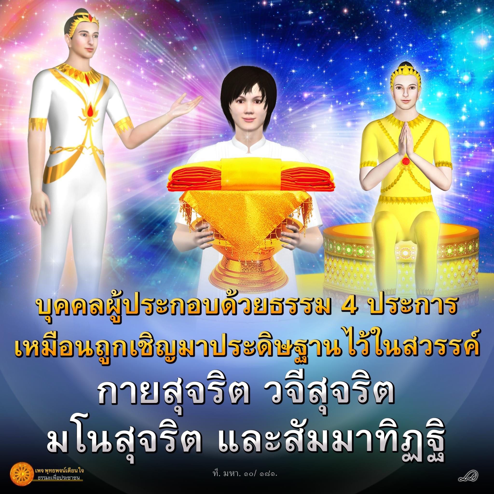“ดูก่อนภิกษุทั้งหลาย บุคคลผู้ประกอบด้วยธรรม 4 ประการ เหมือนถูกเชิญมาประดิษฐานไว้ในสวรรค์ ธรรม 4 ประการเป็นไฉน คือ กายสุจริต วจีสุจริต มโนสุจริต และสัมมาทิฏฐิ" ทิฏฐิสูตร
