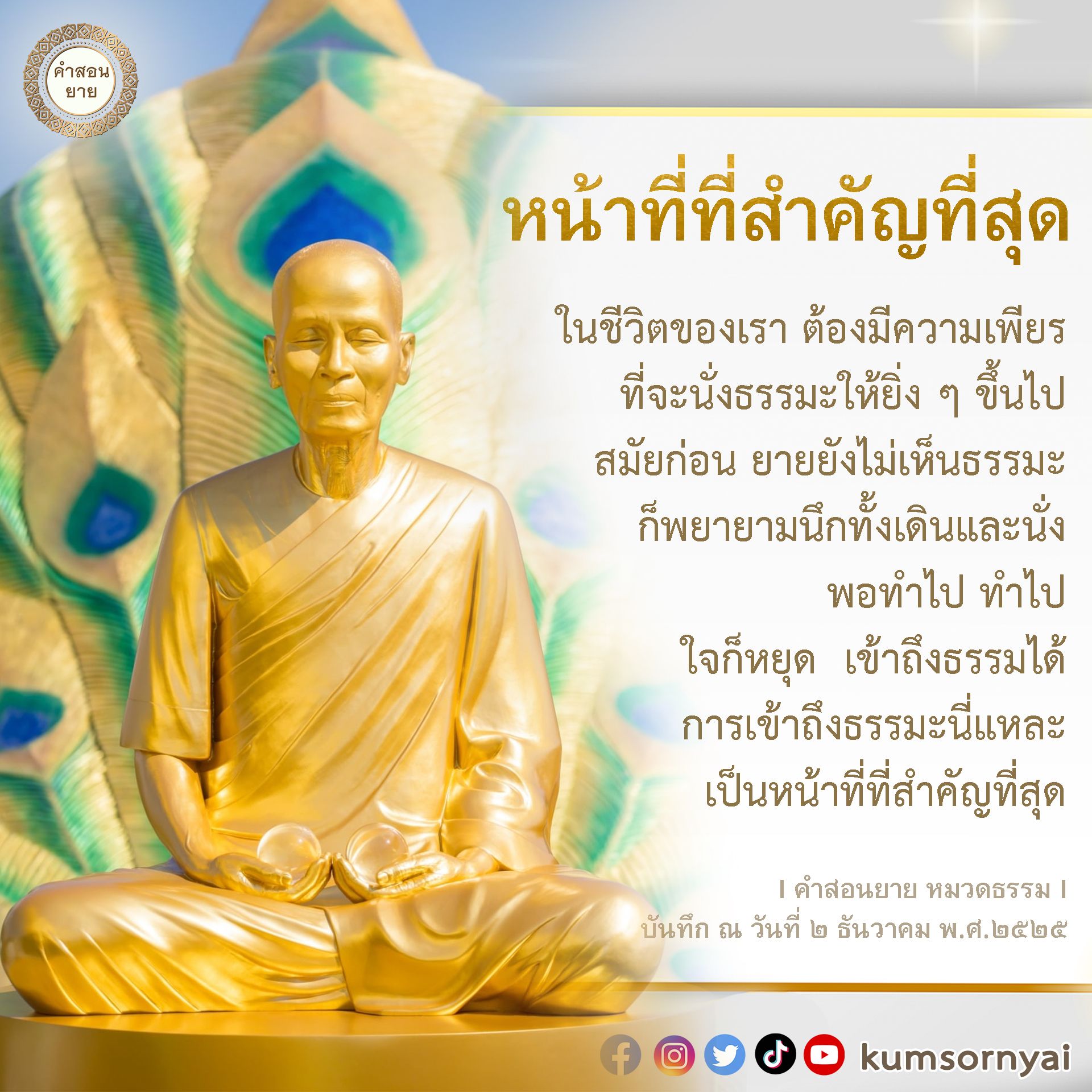 ในชีวิตของเราต้องมีความเพียรที่จะนั่งธรรมะให้ยิ่ง ๆ ขึ้นไป สมัยก่อน ยายยังไม่เห็นธรรมะ ก็พยายามนึกทั้งเดิน และนั่ง พอทำไป ทำไป ใจก็หยุด เข้าถึงธรรมได้ การเข้าถึงธรรมะนี่แหละ เป็นหน้าที่ที่สำคัญที่สุด