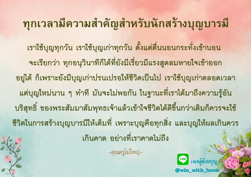 บุญเป็นสิ่งที่อยู่เบื้องหลังความสุข และความสำเร็จทั้งหมด เป็นเครื่องสนับสนุนให้เราเจริญรุ่งเรือง