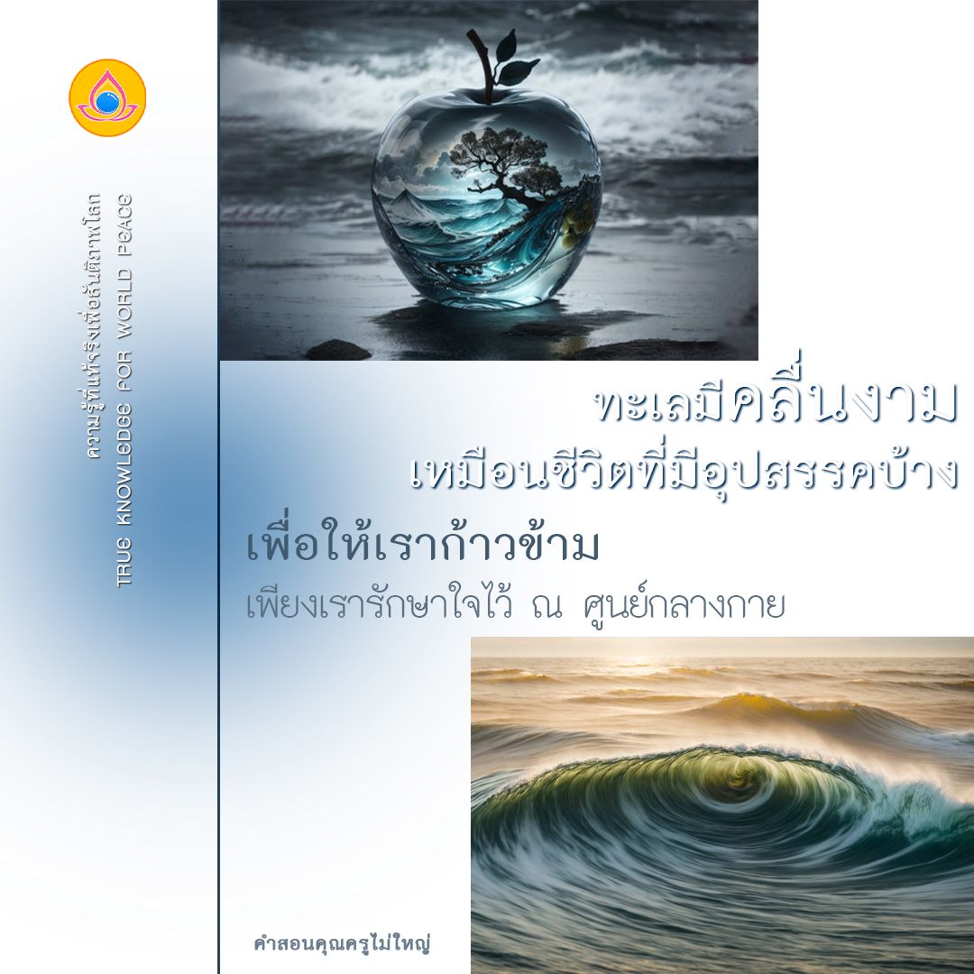 ทะเลชีวิตก็เช่นกัน ต้องมีคลื่นจึงจะงดงาม ต้องมีอุปสรรคกันบ้าง ขอเพียงเรารักษาใจไว้ ณ ศูนย์กลางกาย เหมือนเรายืนอยู่บนกระดานโต้คลื่น โดยไม่หวั่นไหวในทุกๆ สิ่ง จะเป็น คน สัตว์ สิ่งของ การงานหรือเรื่องอะไรต่าง ๆ จงทำใจให้เข้มแข็ง แต่อย่างแข็งกร้าว ต้องแข็งแกร่งเข้าไว้ ด้วยกันฝึกใจหยุดนิ่ง ในสมาธิให้ได้ทุกวัน ...