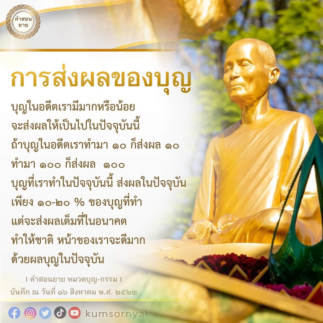 บุญในอดีตเรามีมากหรือน้อย จะส่งผลให้เป็นไปในปัจจุบันนี้ ถ้าบุญในอดีตเราทำมา 10 ก็ส่งผล 10 ทำมา 100 ก็ส่งผล 100 บุญที่เราทำในปัจจุบันนี้ส่งผลในปัจจุบันเพียง 10–20 % ของบุญที่ทำ แต่จะส่งผลเต็มที่ในอนาคต ทำให้ชาติ หน้าของเราจะดีมาก ด้วยผลบุญในปัจจุบัน ดังนั้น เราต้องหัดมักน้อยให้มาก ๆ ถ้าเรามี 100 ใช้ 1,000 ไม่นานก็วิบัติ แต่ถ้าเรามีบุญ 1,000 ใช้แค่ 100 ไม่นานบุญก็