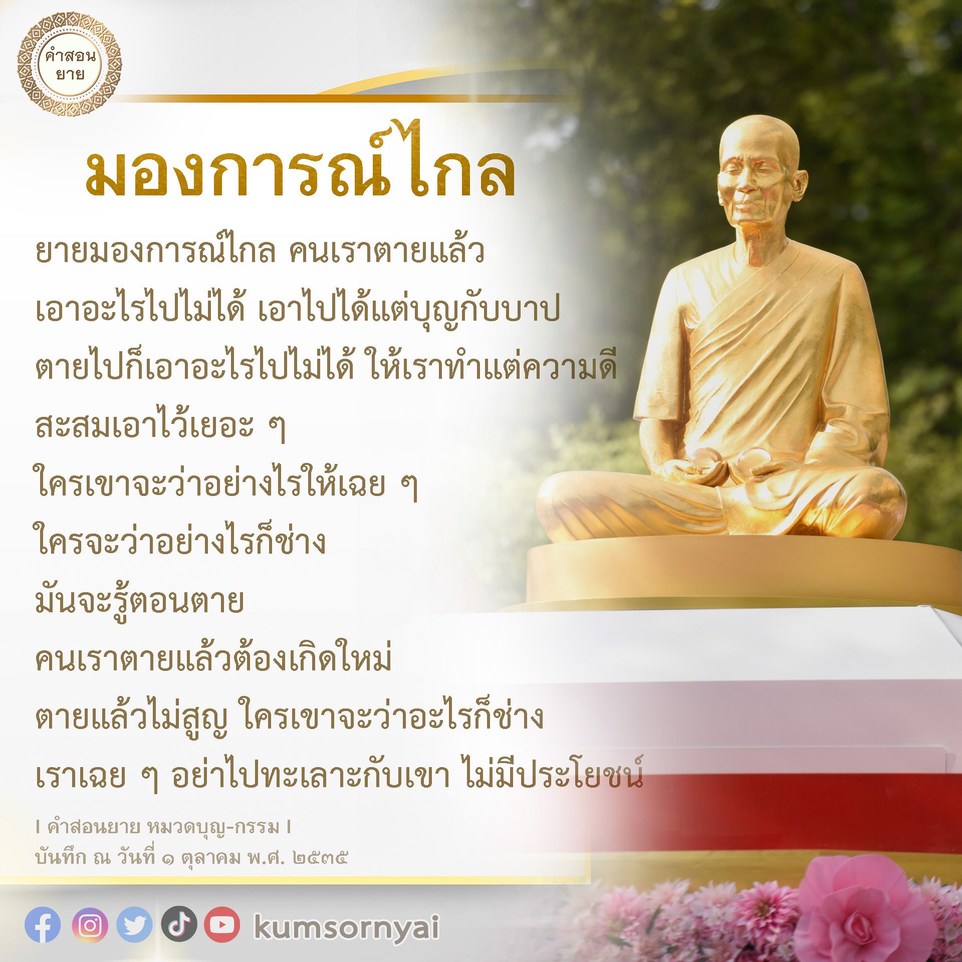 ยายมองการณ์ไกล คนเราตายแล้วเอาอะไรไปไม่ได้ เอาไปได้แต่บุญกับบาป ตายไปก็เอาอะไรไปไม่ได้ ให้เราทำแต่ความดี สะสมเอาไว้เยอะ ๆ ใครเขาจะว่าอย่างไรให้เฉย ๆ ใครจะว่าอย่างไรก็ช่าง มันจะรู้ตอนตาย คนเราตายแล้วต้องเกิดใหม่ ตายแล้วไม่สูญ ใครเขาจะว่าอะไรก็ช่าง เราเฉย ๆ อย่าไปทะเลาะกับเขา ไม่มีประโยชน์