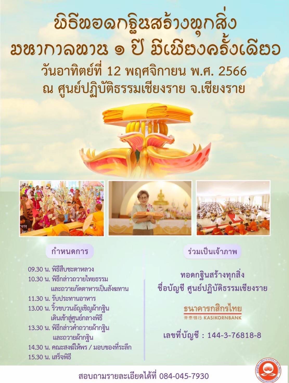 พิธีทอดกฐินสร้่งทุกสิ่ง มหากาลทาน ๑ ปี มีเพียงครั้งเดียว วันอาทิตย์ที่12 พฤศจิกายน พ.ศ.2566 ณ.ศูนย์ปฏิบัติธรรม จ.เชียงราย