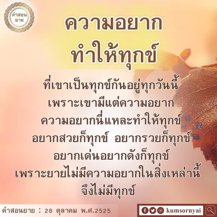 ที่เขาเป็นทุกข์กันอยู่ทุกวันนี้ เพราะเขามีแต่ความอยาก ความอยากนี่แหละทำให้ทุกข์ อยากสวยก็ทุกข์ อยากรวยก็ทุกข์ อยากเด่นอยากดังก็ทุกข์ เพราะยายไม่มีความอยากในสิ่งเหล่านี้ จึงไม่มีทุกข์ ยายมีความสันโดษของยายติดตัวอย่างนี้มานานแล้ว สิ่งของคนอื่น ยายก็ไม่อยากได้ พอใจแต่ของของตัวเอง ความอยากในสิ่งต่างๆ ไม่มีในใจยายเลย มีแต่อยากสร้างความดี สร้างเรื่อยๆให้เป็นบุญล้วนๆ บุญที่สะอาดบริสุทธิ์ ใครจะเป็นอะไรก็ช่างเขา ขอให้ยายได้ทำแต่ความดีมากๆ ให้คิดแต่ที่ดีๆก็พอแล้ว