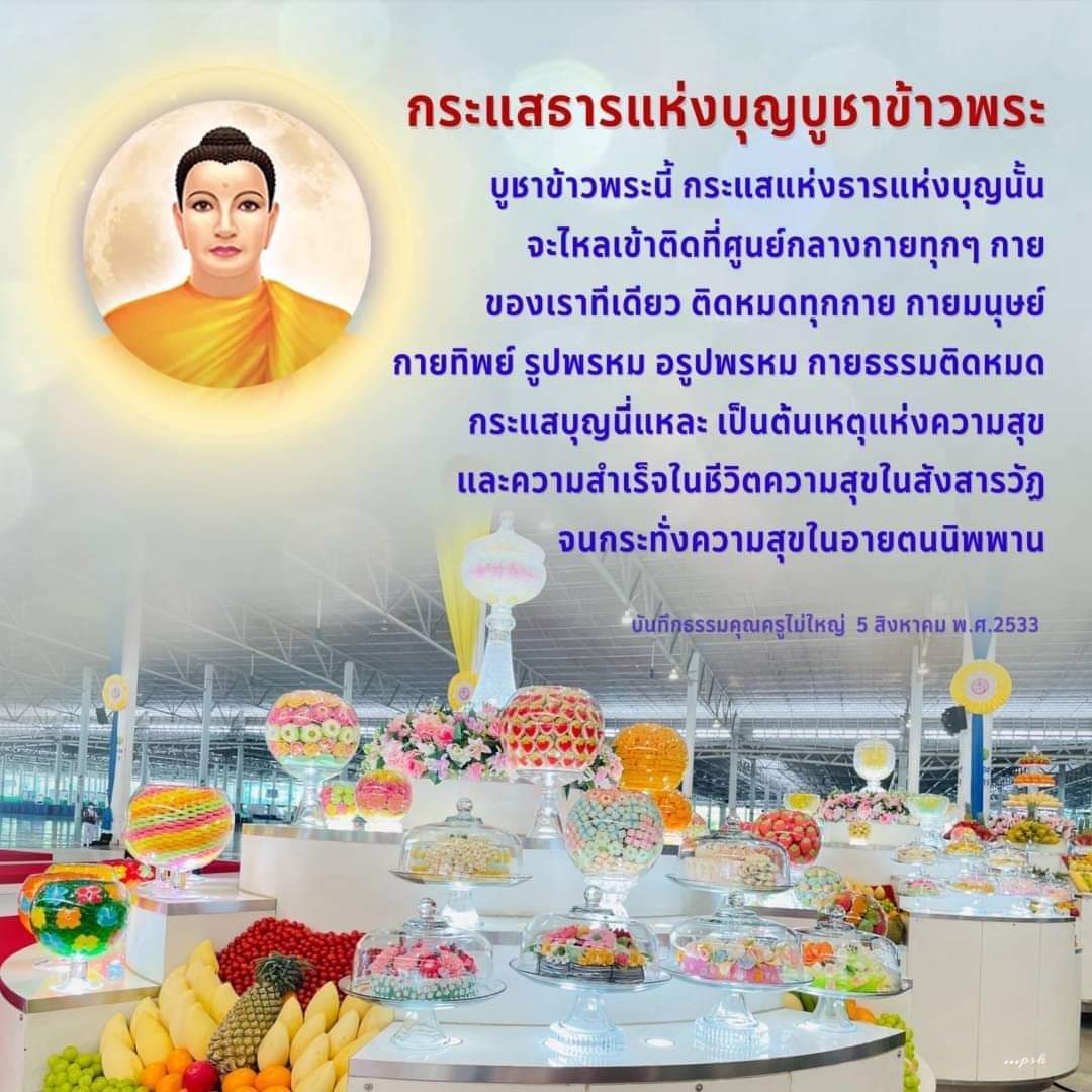 บูชาข้าวพระนี้ กระแสแห่งธารแห่งบุญนั้น จะไหลเข้าติดที่ศูนย์กลางกายทุก ๆ กาย ของเราทีเดียว ติดหมดทุกกาย กายมนุษย์ กายทิพย์ รูปพรหม อรูปพรหม กายธรรมติดหมด