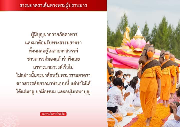 “ ผู้มีบุญมาถวายภัตตาหาร และมาต้อนรับพระธรรมยาตรา ทั้งหมดอยู่ในสายตาสวรรค์ ชาวสวรรค์มองแล้วรำพึงเลย เพราะมาสวรรค์เร็วไป ไม่อย่างนั้นจะมาต้อนรับพระธรรมยาตรา ชาวสวรรค์อยากมาทำแบบนี้ แต่ทำไม่ได้ ได้แต่มาดู ยกมือพนม และอนุโมทนาบุญ ”