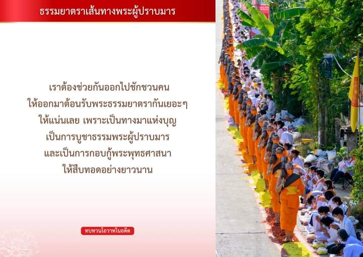 “ เราต้องช่วยกันออกไปชักชวนคน ให้ออกมาต้อนรับพระธรรมยาตรากันเยอะๆ ให้แน่นเลย เพราะเป็นทางมาแห่งบุญ เป็นการบูชาธรรมพระผู้ปราบมาร และเป็นการกอบกู้พระพุทธศาสนาให้สืบทอดอย่างยาวนาน ”