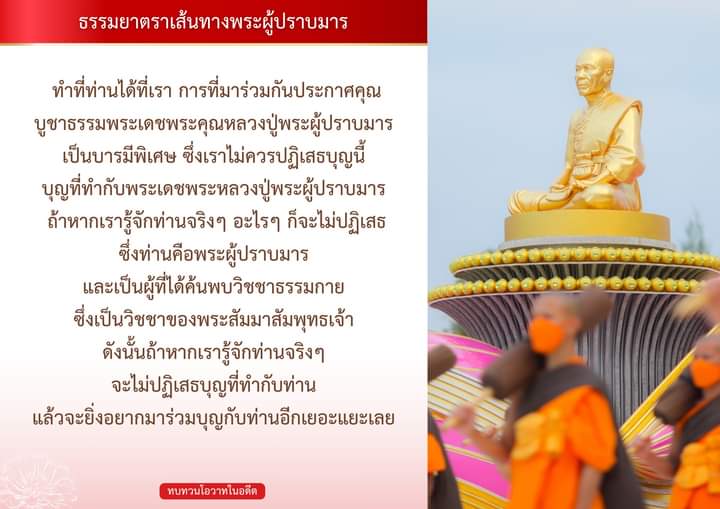 “ ทำที่ท่านได้ที่เรา การที่มาร่วมกันประกาศคุณ บูชาธรรมพระเดชพระคุณหลวงปู่พระผู้ปราบมารเป็นบารมีพิเศษ ซึ่งเราไม่ควรปฏิเสธบุญนี้ บุญที่ทำกับพระเดชพระหลวงปู่พระผู้ปราบมาร