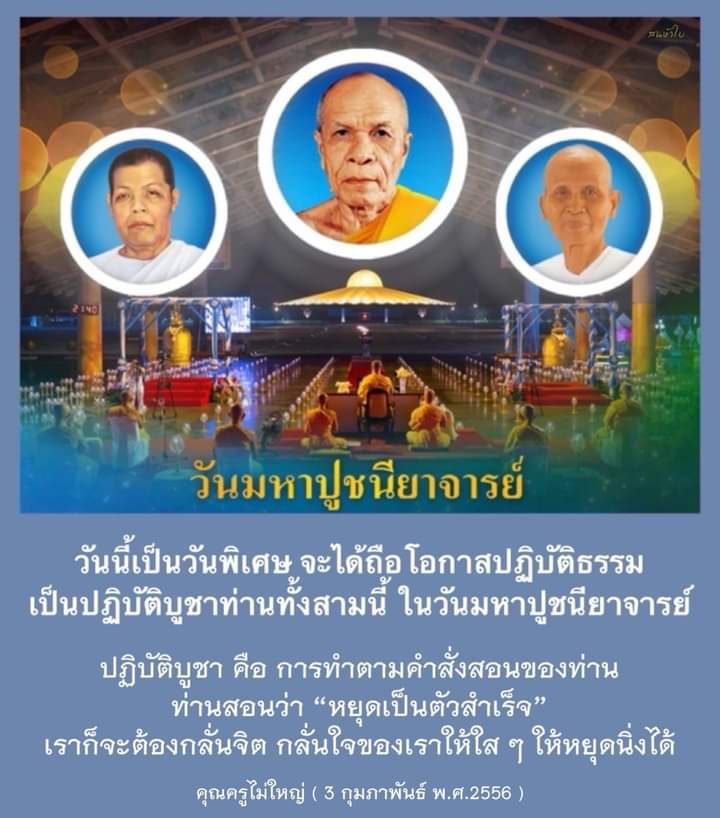 ••• คุณยายทองสุข ท่านก็ได้หมดอายุสังขารในวันนี้ คุณยายอาจารย์ฯ ก็สลายร่างในวันนี้ เพราะฉะนั้นวันนี้เป็นวันพิเศษ จะได้ถือโอกาสปฏิบัติธรรม เป็นปฏิบัติบูชาท่านทั้งสามนี้ ในวันมหาปูชนียาจารย์ ปฏิบัติบูชาคือ การทำตามคำสั่งสอนของท่าน