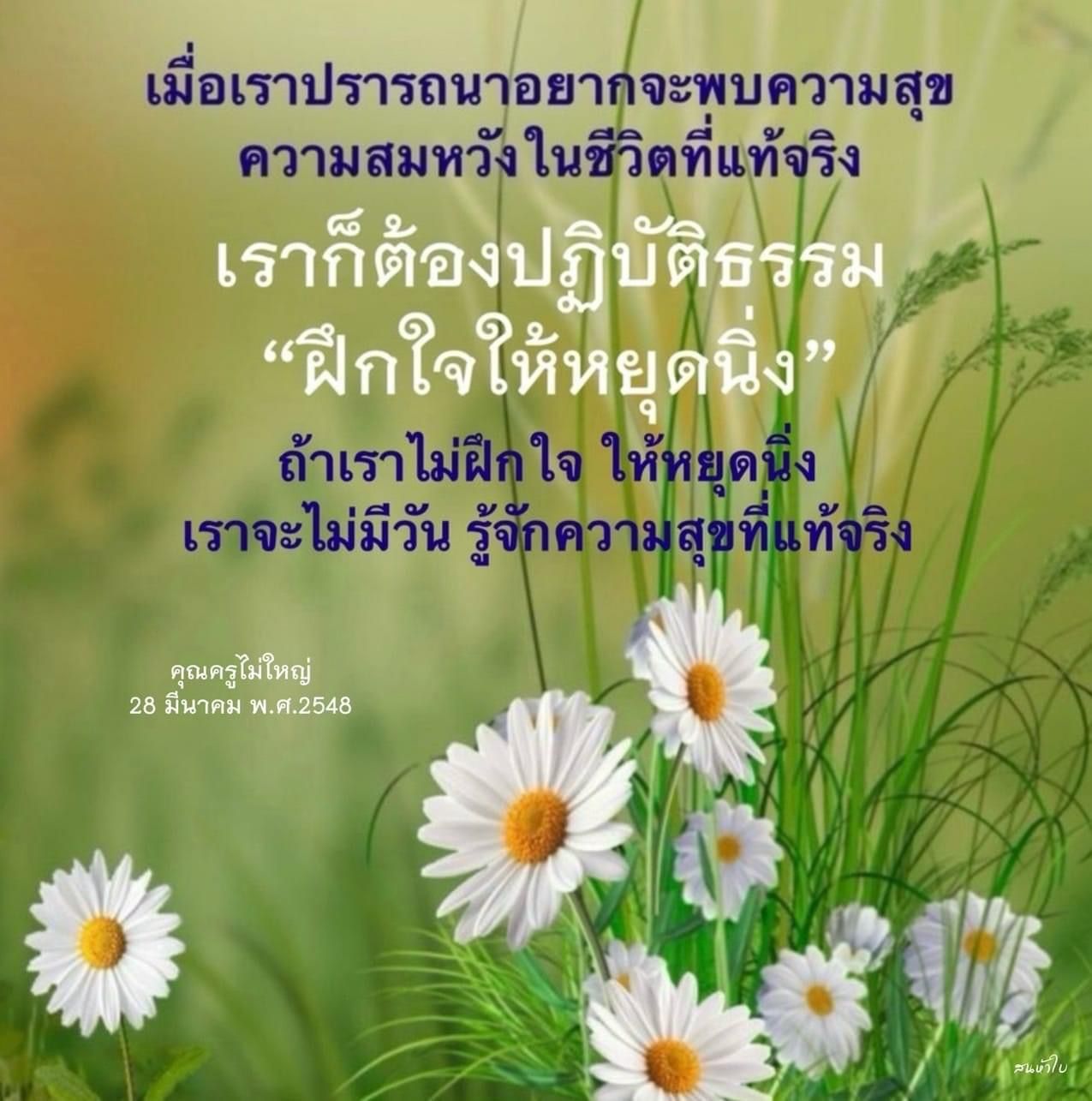 ••• เราจะแสวงหาความสุขที่แท้จริงจากทรัพย์ วัตถุภายนอก คน สัตว์ สิ่งของไม่ได้เลย จะเดินทางไกลไปเที่ยวต่างประเทศ จะดื่ม จะดริ้ง จะอะไรก็แล้วแต่ มันไม่เจอทั้งนั้น เพราะความสุขที่แท้จริง มันอยู่ที่หยุดกับนิ่งตรงนี้