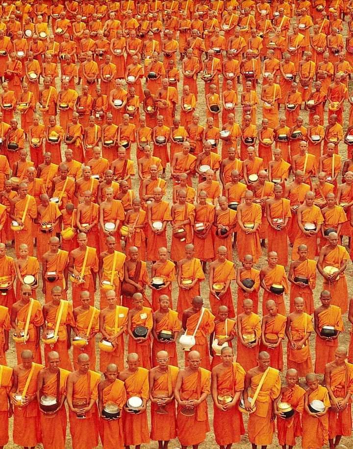 พระสงฆ์ผู้ปฏิบัติดีปฏิบัติชอบ เข้าแถวกันใน การ เซท ถ่ายภาพพระสงฆ์ ถือบาตร มาร่วมใจกันเข้าแถวอย่างเป็นระเบียบ มีกันอย่างล้นหลาม สีจีวรเหลืองอร่าม งดงามยิ่งนัก
