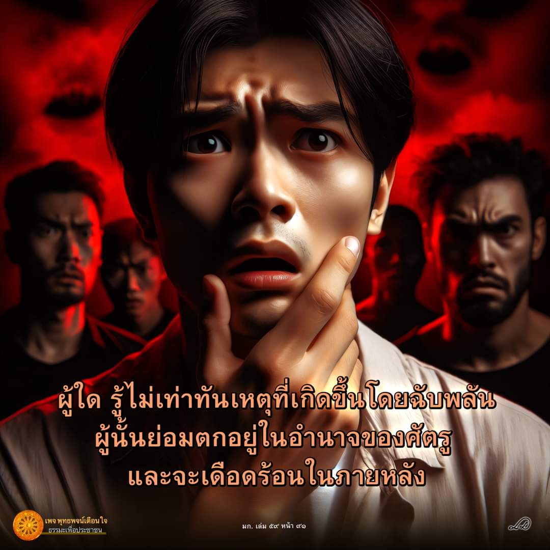 “ก็ผู้ใด รู้ไม่เท่าทันเหตุที่เกิดขึ้นโดยฉับพลัน ผู้นั้นย่อมตกอยู่ในอำนาจของศัตรู และจะเดือดร้อนในภายหลัง