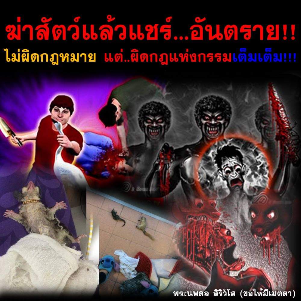 ไม่ว่าจะเป็นการฆ่าเพื่อความสะใจหรือเป็นการฆ่าด้วยเหตุผลใดก็ตาม สัตว์ก็เป็นสิ่งมีชีวิตเหมือนกัน ถ้าเราได้ศึกษาเรื่องกฎแห่งกรรมอย่างดีแล้วสัตว์นั้นก็คืออดีตมนุษย์ เพียงแค่ชาตินี้ต้องเกิดมารับผลแห่งกรรมในอัตภาพของสัตว์เท่านั้น เราจึงไม่มีสิทธิที่จะฆ่าเขา เพราะถ้าฆ่าแล้วย่อมเป็นบาป ผิดกฎแห่งกรรมถึงไม่ผิดกฎหมายก็ตาม