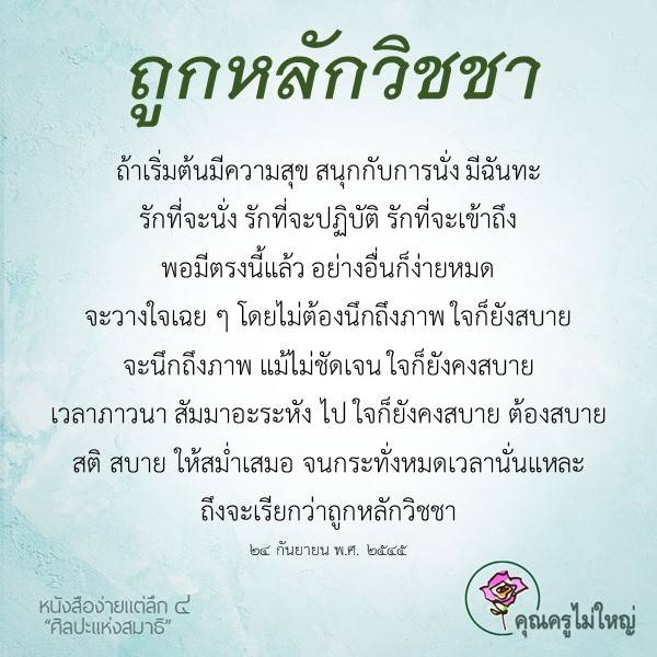 จะวางใจเฉยๆ โดยไม่ต้องนึกถึงภาพใจก็ยังสบาย จะนึกถึงภาพ แม้ไม่ชัดเจนใจก็ยังคงสบาย เวลาภาวนา สัมมาอะระหัง ไป ใจก็ยังคงสบาย ต้องสบาย สติ สบาย ให้สม่ำเสมอ จนกระทั่งหมดเวลานั่นแหละ ถึงจะเรียกว่าถูกหลักวิชา