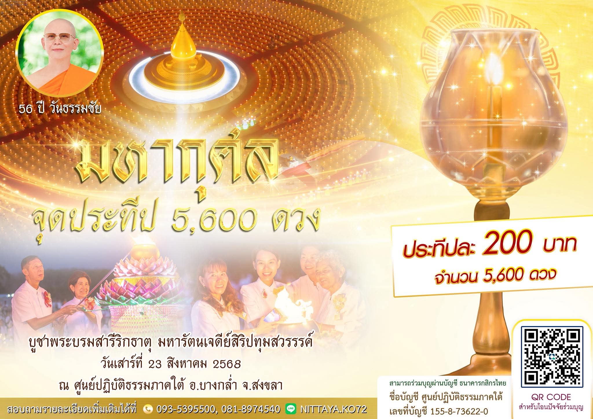 ขอเชิญร่วมบุญจุดประทีป 5,600 ดวง เนื่องในวาระ 56 ปี #วันธรรมชัย (วันคล้ายวันอุปสมบทหลวงพ่อธัมมชโย) เพื่อน้อมถวายเป็นพุทธบูชา