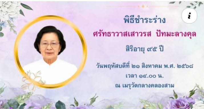 วันพฤหัสบดีที่ 21 สิงหาคม 2568 เวลา 14:00 น ณเมรุวัดกลางคลองสาม รักการสร้างบุญตลอดมา ขอกราบอนุโมทนาบุญด้วยนะคะ