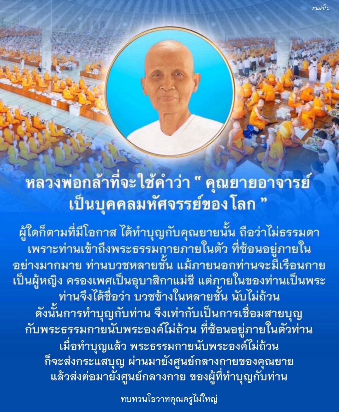 ผู้ใดก็ตามที่มีโอกาส ได้ทำบุญกับคุณยายนั้น ถือว่าไม่ธรรมดาเพราะท่านเข้าถึงพระธรรมกายภายในตัว ที่ช้อนอยู่ภายในอย่างมากมาย ท่านบวชหลายชั้น แม้ภายนอกท่านจะมีเรือนกาย