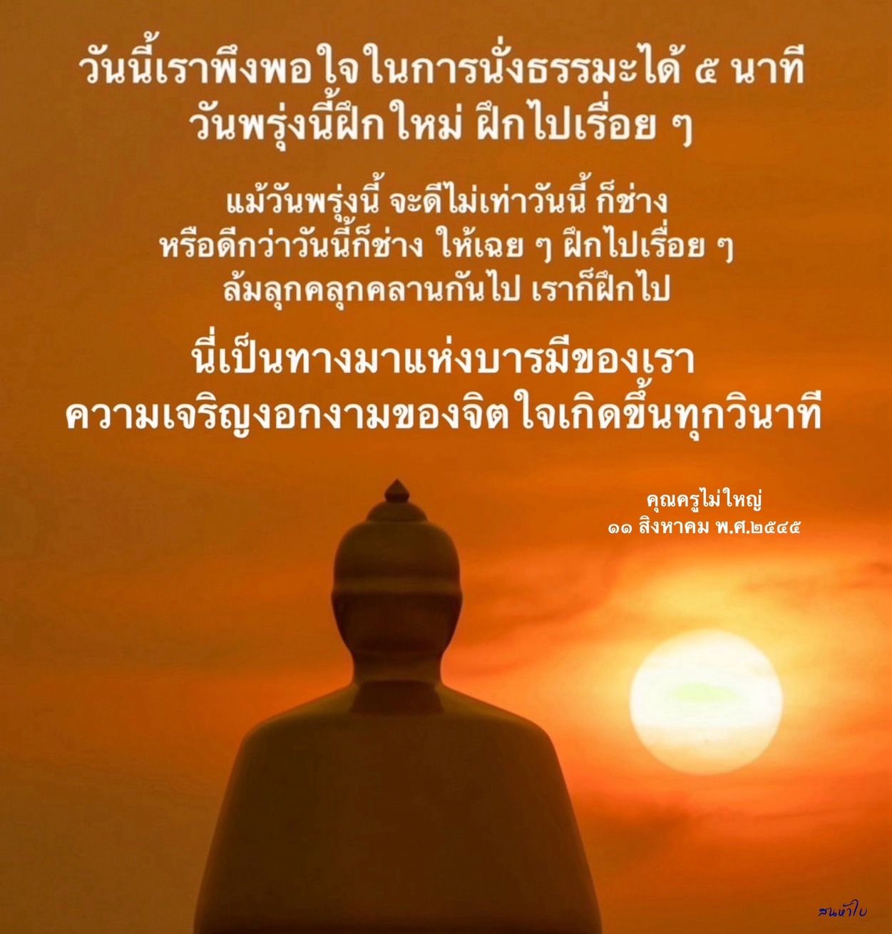 ••• วันนี้เราพึงพอใจในการนั่งธรรมะได้ 5 นาที วันพรุ่งนี้ ฝึกใหม่ ฝึกไปเรื่อย ๆ แม้วันพรุ่งนี้จะดีไม่เท่าวันนี้ ก็ช่าง หรือดีกว่าวันนี้ก็ช่าง ให้เฉย ๆ ฝึกไปเรื่อย ๆ ล้มลุกคุลุกคลานกันไป เราก็ฝึกไป