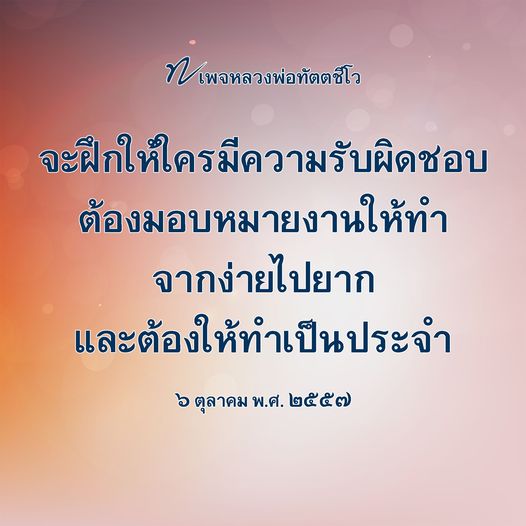 ต้องมอบหมายงานให้ทำจากง่ายไปหายาก แล้วต้องทำชนิดเป็นประจำ จะประจำวัน ประจำเดือน ประจำปีอะไรก็ตามที ต้องให้ทำเป็นประจำ แล้วก็จะกลายเป็นความรับผิดชอบ